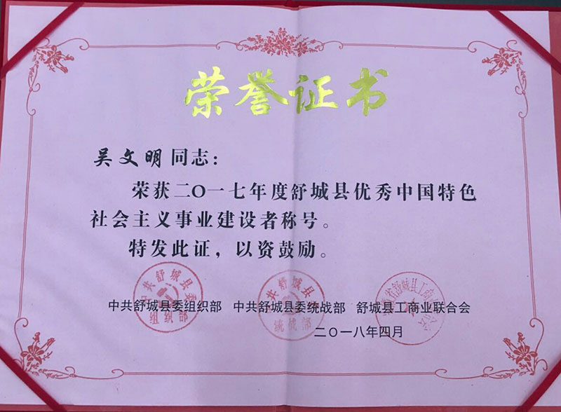 熱烈祝賀我公司董事長吳文明先生榮獲“2017年度舒城縣優(yōu)秀中國特色社會主義建設者”稱號。